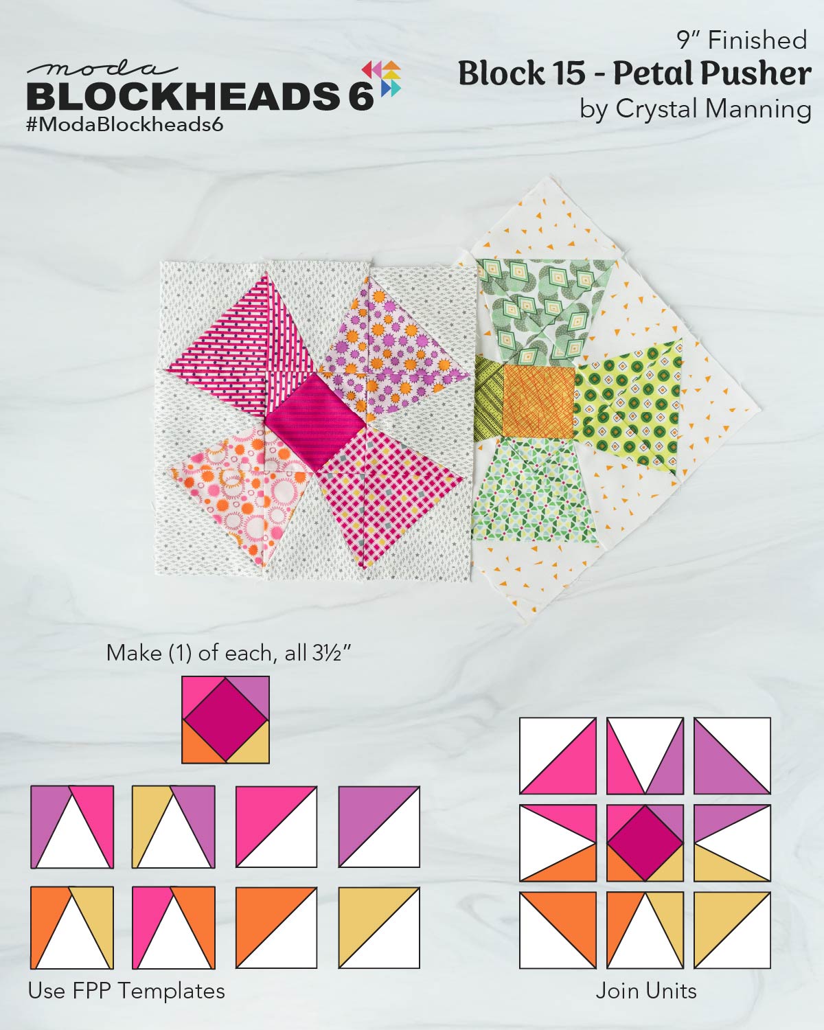 Happy Blockheads Wednesday! This week we’re excited to share Block 15: Petal Pusher, designed by Crystal Manning. Anna Dineen is walking us through the construction of this fun, retro-inspired block in the video tutorial below.