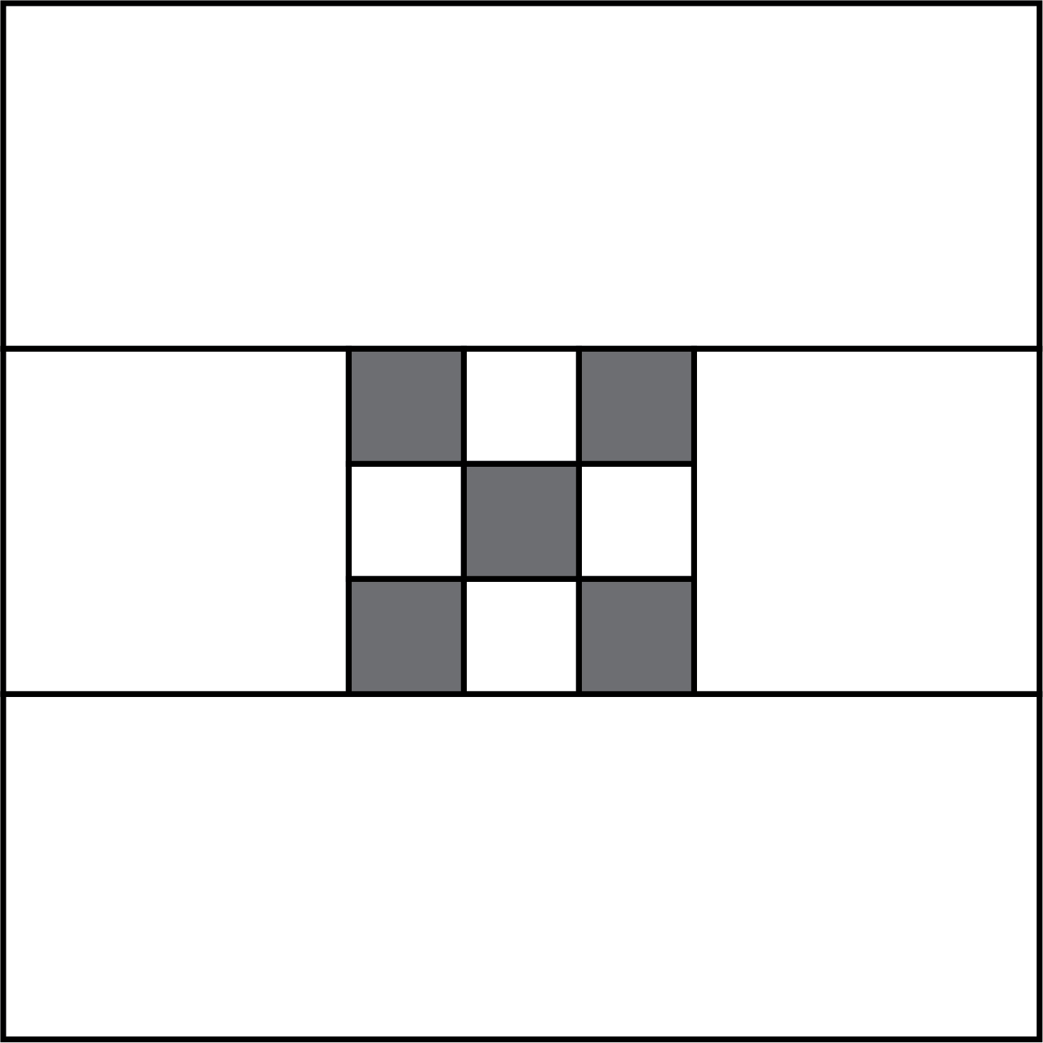 The star of this block is the nine patch center. Arrange your 1½″ squares in a simple 3x3 grid, taking care with placement if you’re mixing colors or using directional prints. Sew your rows together, then join the rows into a finished nine patch.