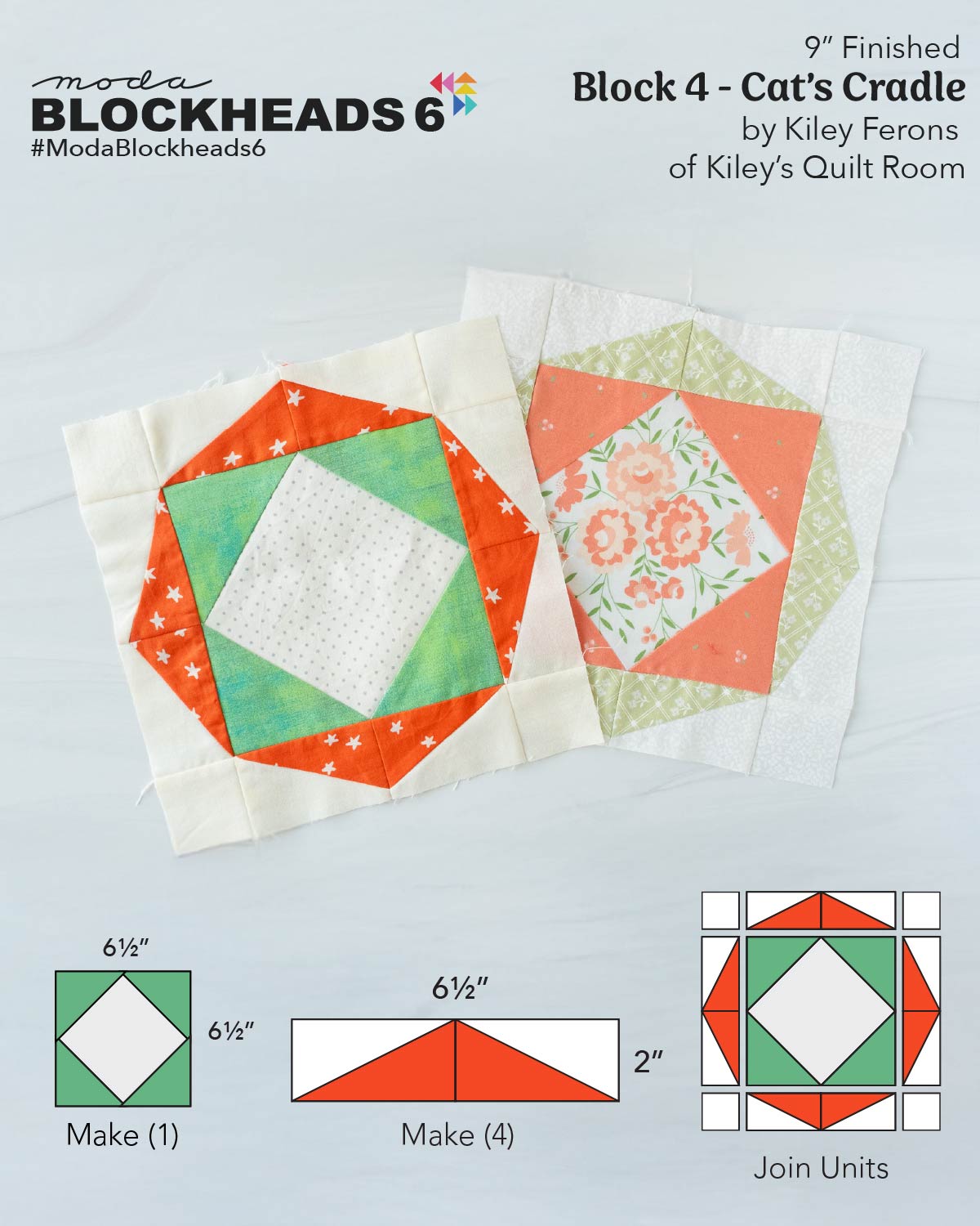 Welcome back to Blockheads 6! This week we’re thrilled to introduce Block 4: Cat’s Cradle, designed by the newest member of the Moda designer family, Kiley Ferons of Kiley’s Quilt Room. This is Kiley’s first time participating in Blockheads, and we’re so excited to showcase her cheerful and dynamic block design.