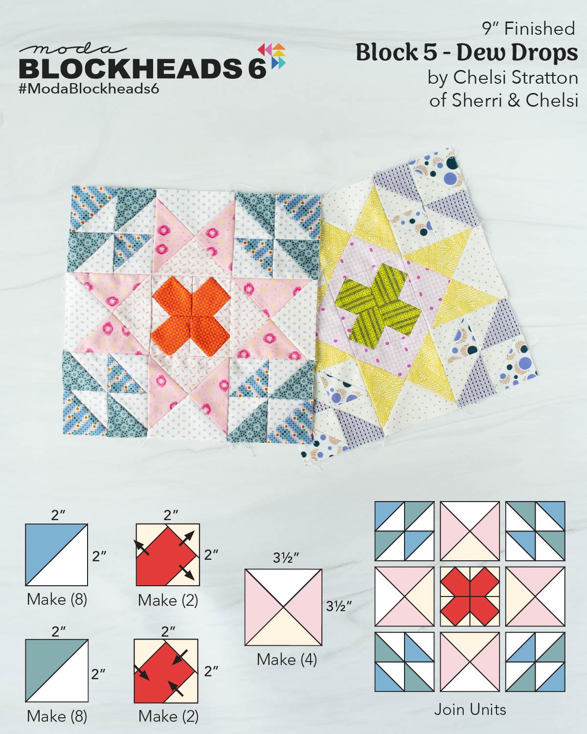 Welcome to Week 6 of Blockheads 6! This week, we’re excited to feature Block 5: Dew Drops, designed by Chelsi Stratton of Sherri & Chelsi. With its sweet layout of half square triangles, snowballed squares, and quarter square triangles, this block is full of movement and charm—just like morning dew glistening in the sun.