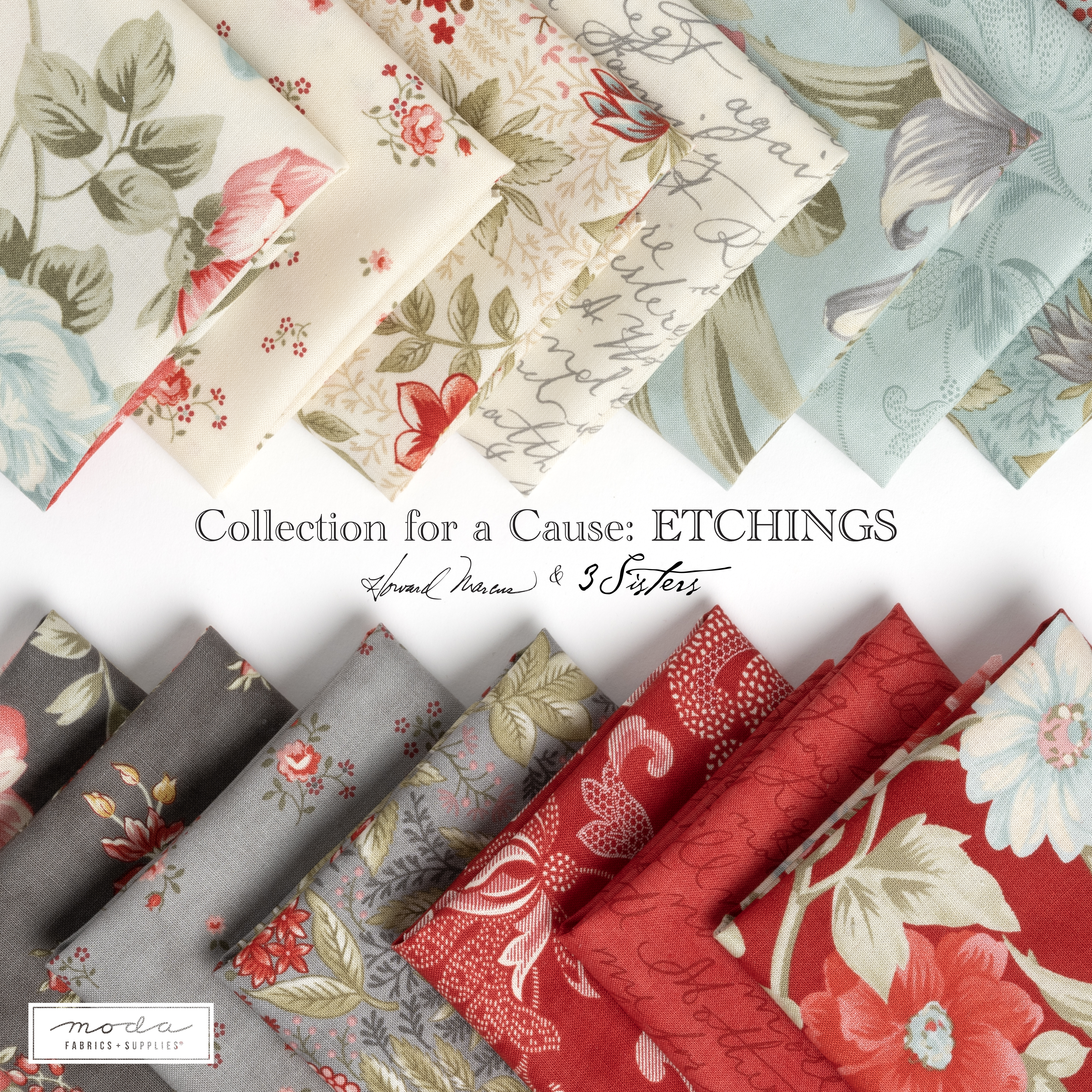Each of the Collections for a Cause fabric lines tells a story and this one is special. Howard Marcus and 3 Sisters are honored to combined talents to create Collections for a Cause, Etchings. In homage to the original Etchings collection by 3 sisters, they have worked together to curate this line of opulent florals and jacobean designs from our antique mill books and textile archives. Rich, warm shades of crimson, aqua, and stone are set against parchment background fabrics to create a fresh and inviting collection with timeless appeal.