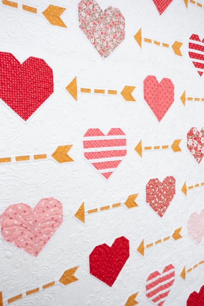 The standout quilt from this collection is Playing Cupid, a layer cake quilt that showcases whimsical hearts and arrows, made even more delightful with Vanessa’s signature goldie magic dot fabric.