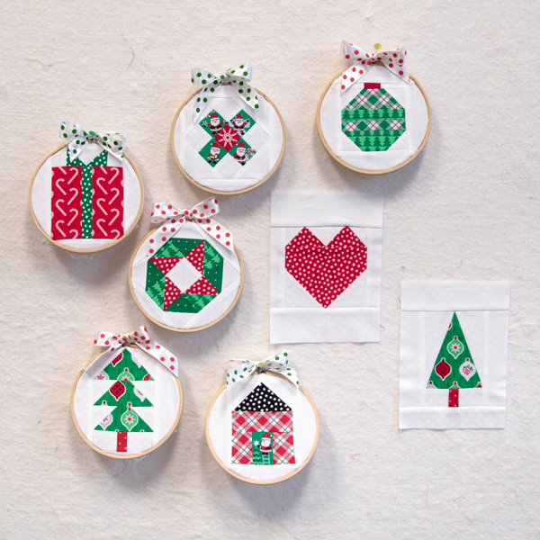 These use a 6" embroidery hoop, so if you're using blocks you've already made, you'll want just a dab of glue to keep the short sides of the block (5 1/2") from popping out of the hoop. If you haven't sewn yet, just make your blocks a little wider rather than the 5 1/2" written, to give a little extra fabric to fit into the hoop.