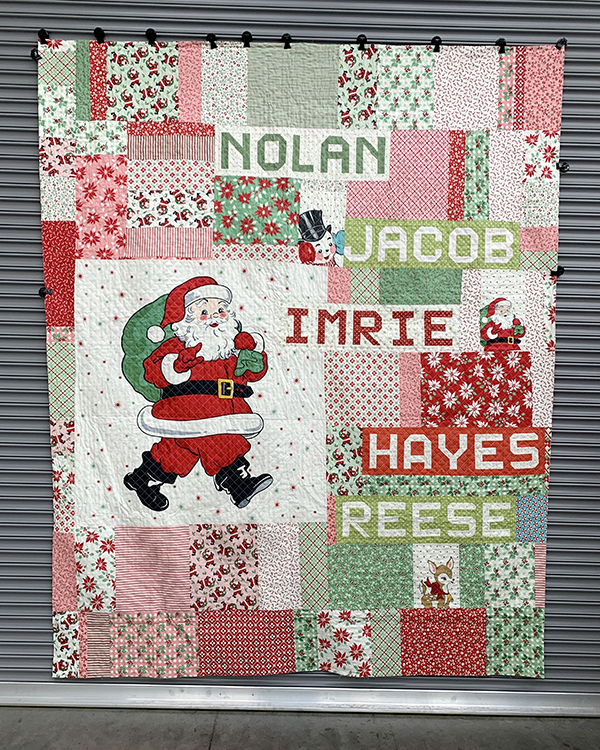 Christmas is all about her family, so Lissa made blocks for each of her grandkids names to include in her backing. And once you're going a little scrappy, why not go all the way? She's even gone the extra step to use pieces of Santa panels from Holly Jolly by Urban Chiks in a few places. Talk about 2 sided quilts!