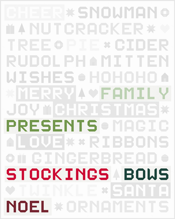 Month 5 (this post): BOWS, STOCKINGS, FAMILY, NOEL, PRESENTS