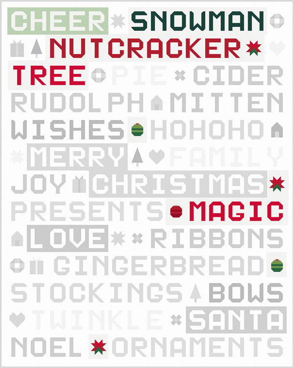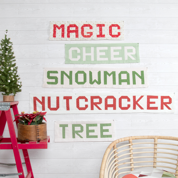 Merry 25th of September! This is our third check-in post for the Letters to Santa QAL. Read on for sashing/assembly instructions for a batch of 5 words from the main Moda quilt, 2 filler block patterns, and instructions to make a CHEER-ful pillow using elements from the QAL.