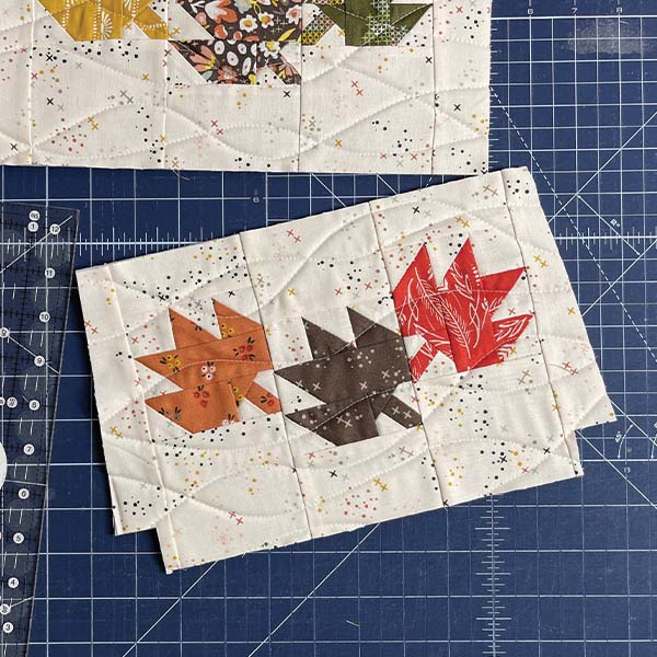 Follow the directions in the pattern to cut all pieces for the pouch. Since these leaf blocks finish at 3”, you’ll likely want to choose small scale or tonal prints for the leaves.