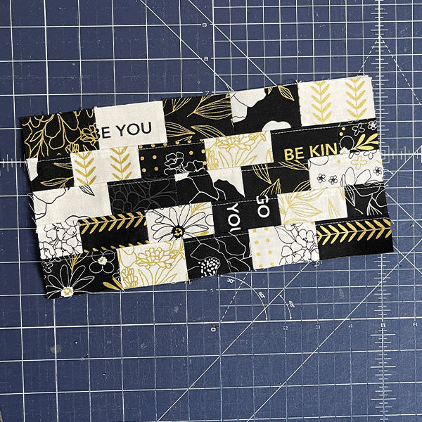 Join the rows together, offsetting them to create the "brickyard" effect. Adhere interfacing to the wrong side. Add any decorative stittching and trim to size as specified in the pattern.