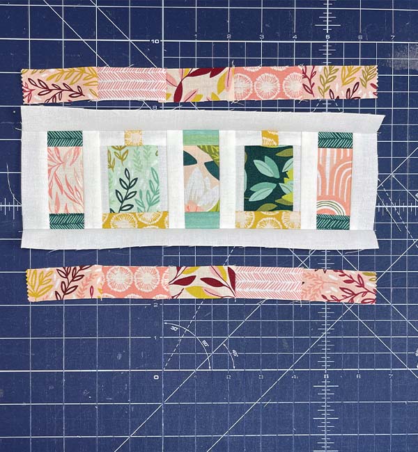 Add the sashing strips between spools and above and below the spool panel. Then the scrappy border strip above and below.