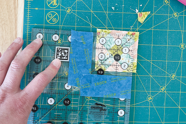 As you can see in the photo below, I have placed tape along the area that I want to trim to. And then I am using the 45 degree line on my ruler to "split" the center square in the block in half to keep it centered.