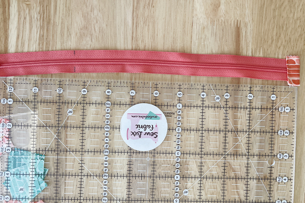Place the zipper face down on the right side of one exterior and align it with the top edge of the pouch, centering it and leaving about 1/2" on either side. The zipper will be sandwiched between the exterior and lining.