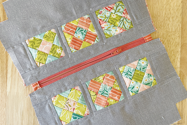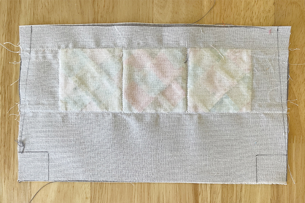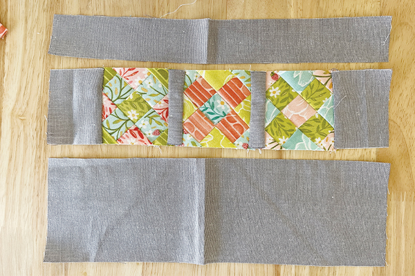 You'll follow the directions in the pattern to sash the blocks together and then add top and bottom borders to make the pouch exteriors for the front and back.