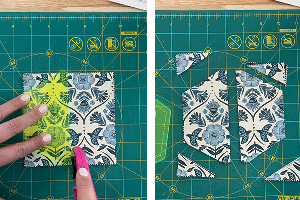 Follow the directions in the pattern to create a half hexagon template and cut all your pieces. I like to trace the template shape on paper and then use it to make a cardboard template using the chipboard backing that comes in a Charm Pack. If you have a Project Jelly Roll ruler, you can skip the template making!