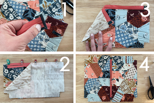 Follow the directions in the pattern to make and add tabs to the ends of the zipper.