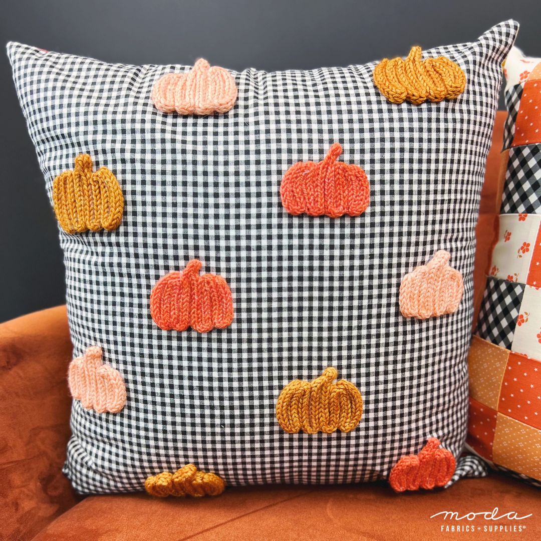 Jessie made the cutest pumpkins and ghosts with her knitted cord and attached them to a couple of pillow covers we stitched up! The pillow fronts are made with Moda wovens, and the pillow backs are festive patchwork – making these pillows reversible for double the fun.