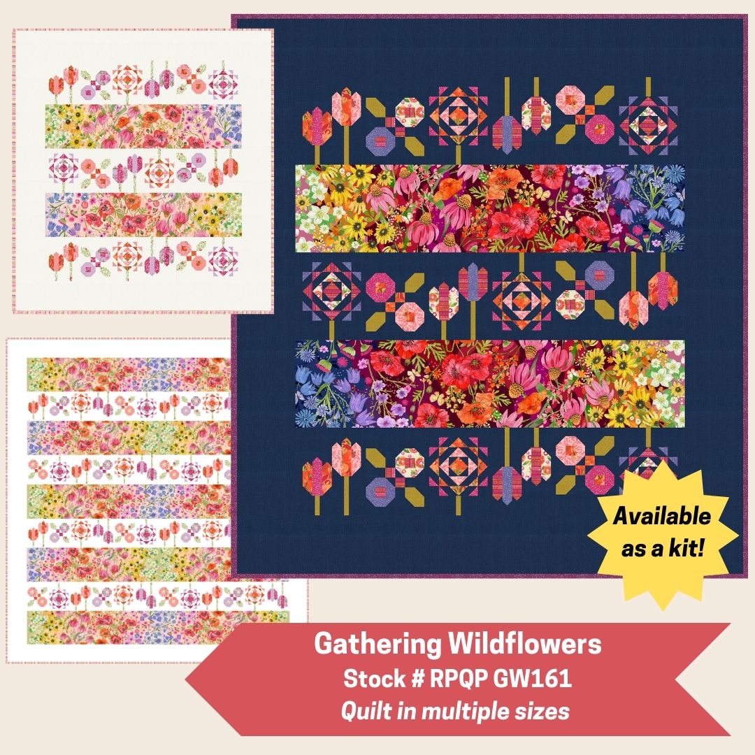 Gathering Wildflowers uses fat quarters or ¼-yard cuts to make sweet flower blocks that line up between the panels. The dark version is available as a Moda kit!