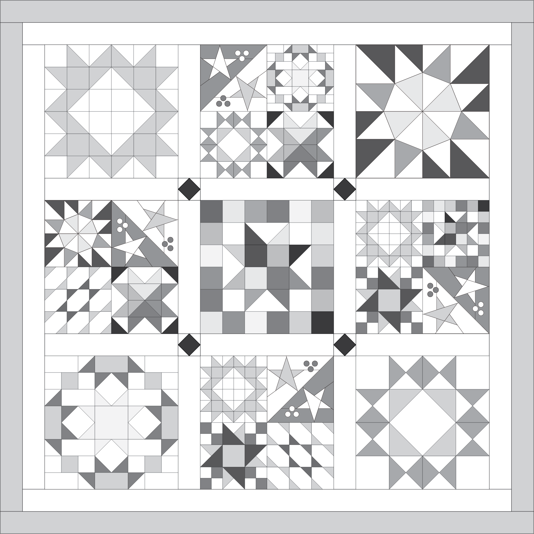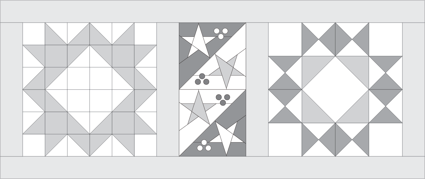 The first setting option is a very simple lap quilt. We have a lot of beginning quilters in our group, so I wanted to provide a simple, straightforward lap quilt setting. If this is your very first quilt and you want something that is beginner-friendly, or you want a smaller-sized quilt in a hurry – this setting is for you. It features sashed blocks with square-in-a-square sashing posts for a little visual interest.