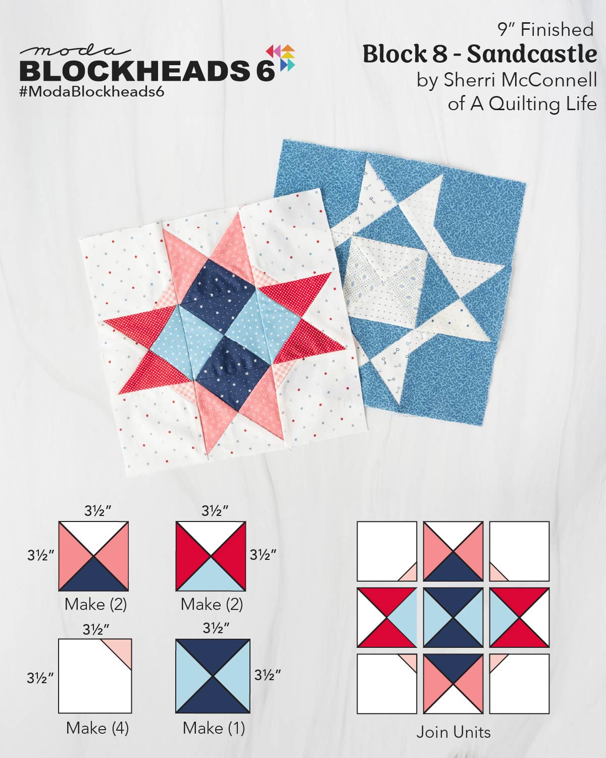 Don’t forget to download the free pattern from the Moda blog, and when your Sandcastle is complete, share your work in the Moda Blockheads 6 Facebook group or on Instagram with the hashtag #modablockheads6.
