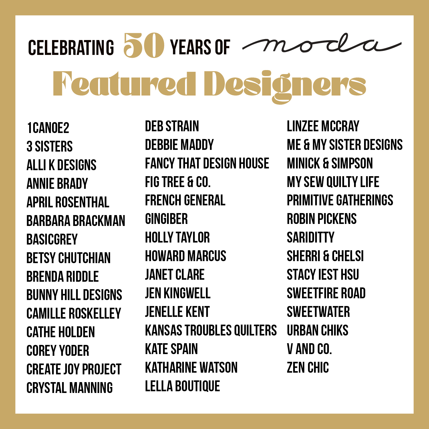 - You can find the "Celebrating 50 Years of Moda" fabric collection at your favorite quilt shops. Be sure to remember where you purchased your fabric—we’ll ask for this information in your entry form!