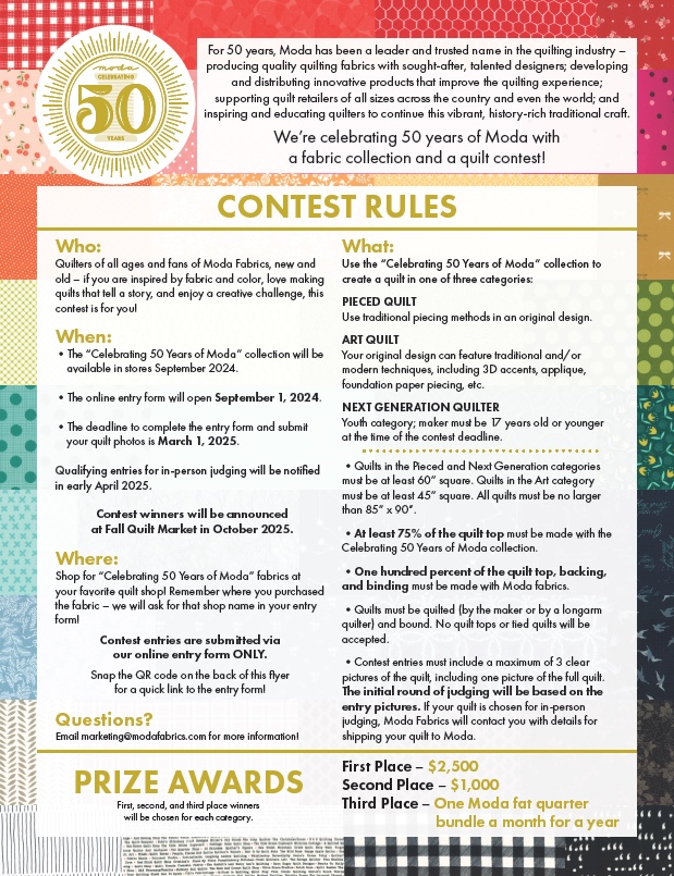 This anniversary is more than just a milestone for Moda Fabrics; it’s a celebration of the vibrant, ever-growing community of quilters who have made this journey so special. We can’t wait to see the incredible quilts that you create as part of this contest, and we look forward to celebrating 50 years of Moda with all of you.