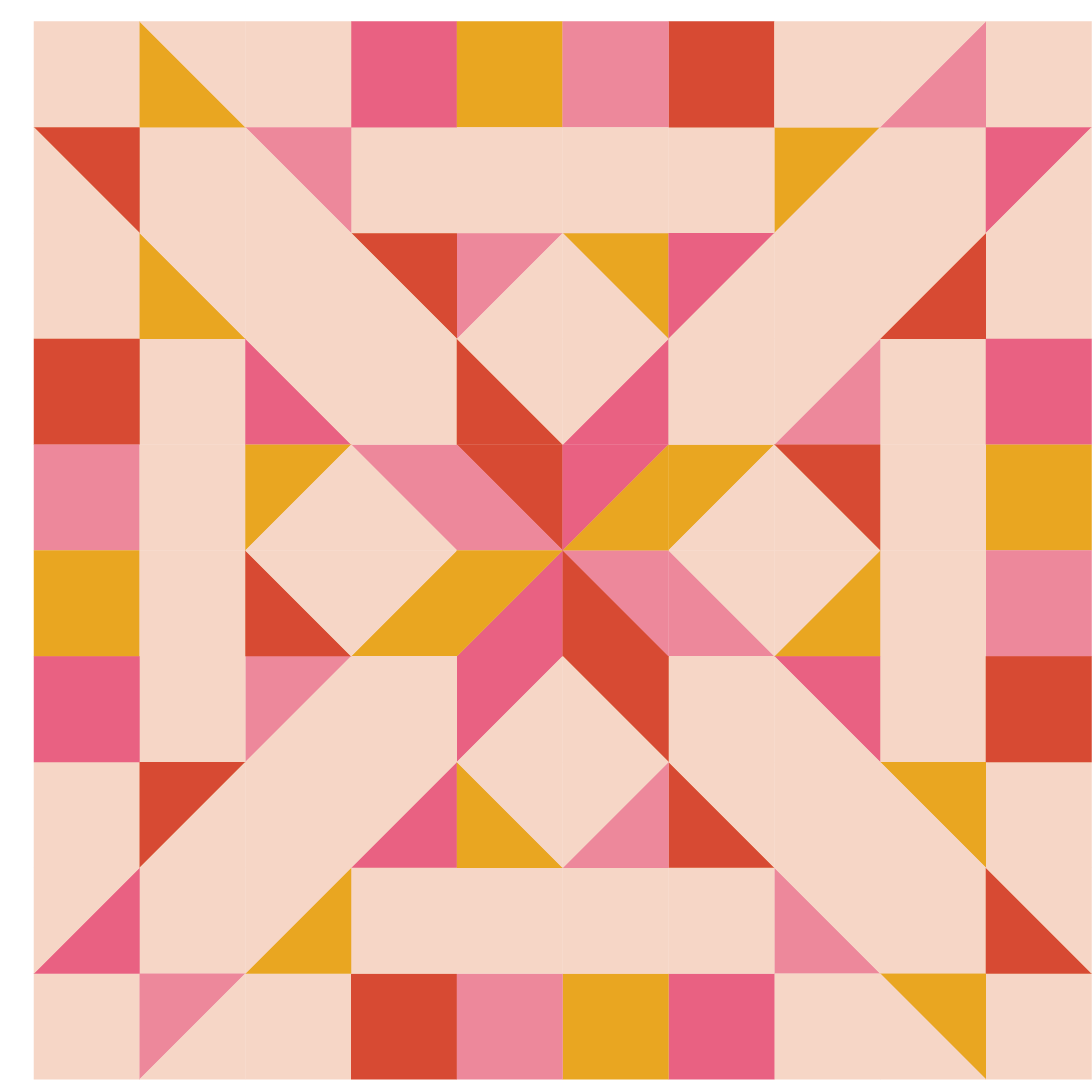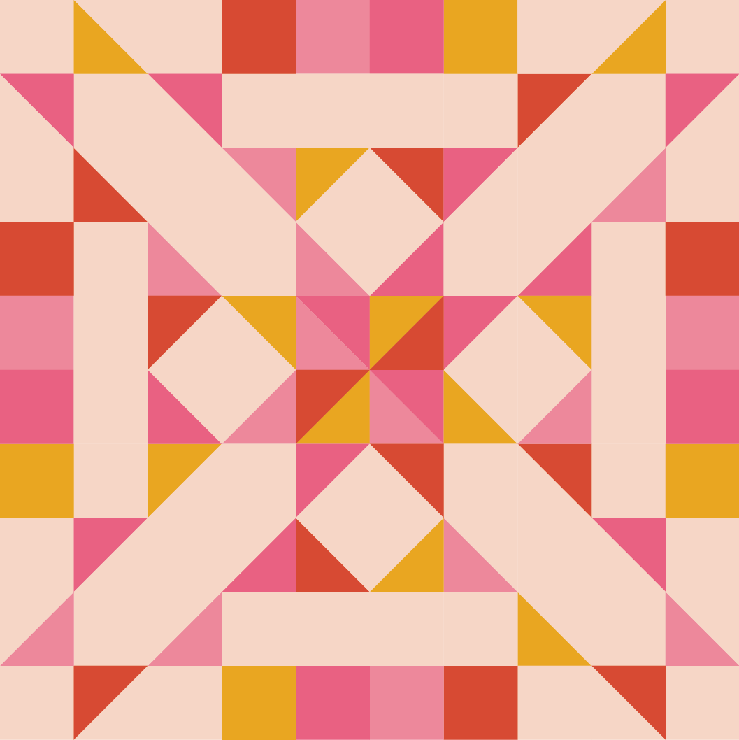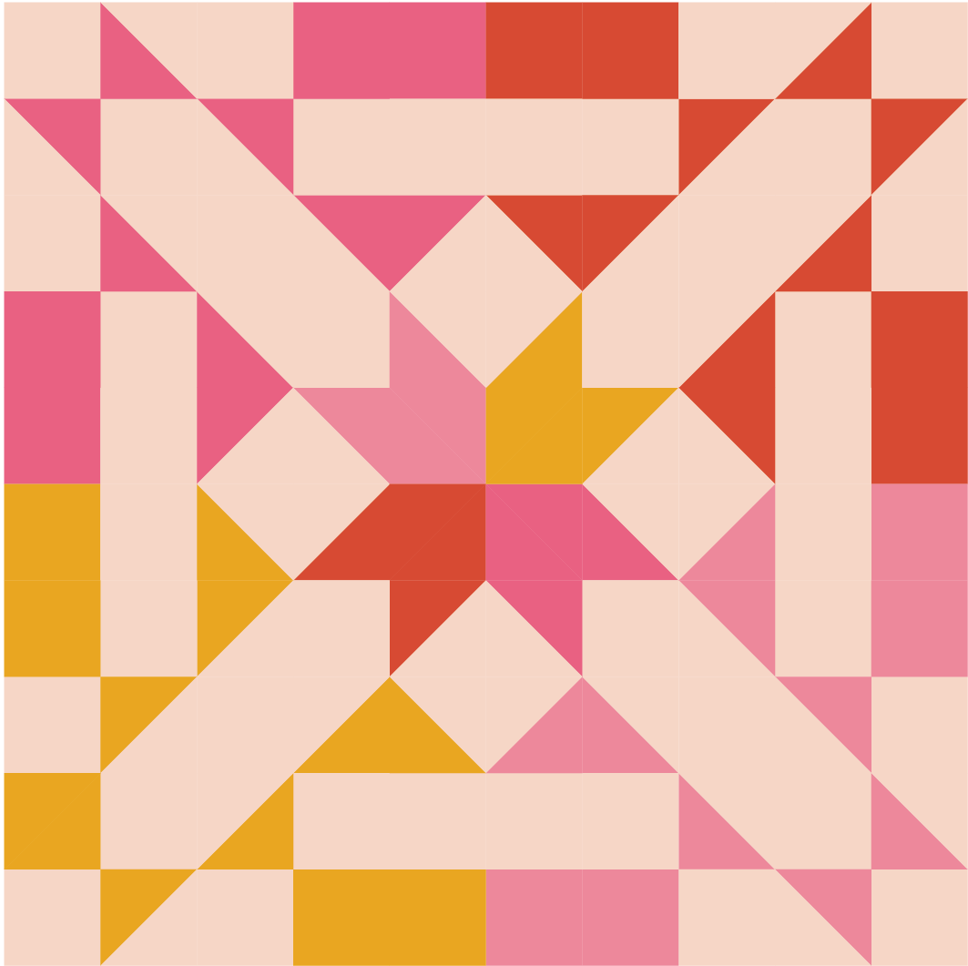 For a clean center finish, swap out one corner background square on each mini quilt for a print/print HST. You can stop there and your quilt will measure 80” x 80”.
