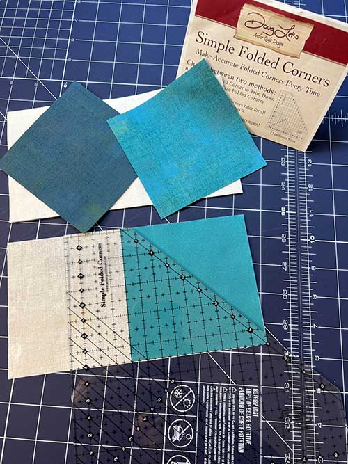 The ruler is packaged with detailed instructions about how to use it to create a variety of triangle patchwork units. I used the “No-Trim/Exact Size Folded Corners” method for my units.