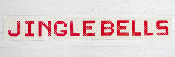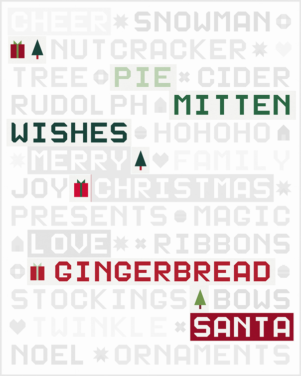 The blocks shown are from Moda's Lissa Alexander's version of the quilt, made using scrappy reds, greens, and low volumes. You'll notice that Lissa has actually made a substitution of one of the words in her quilt--'GINGERBREAD' was the planned word for this month, but it just didn't feel right for a holiday quilt in her family so she replaced it with 'JINGLE BELLS' instead.  It's as easy as that if you want to swap out a word!