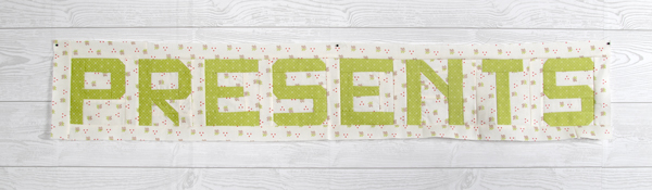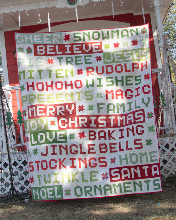 You can see even in Lissa's quilt, she made a few substitutions with words that were more appropriate for her family and how they celebrate the holidays, and stuck with just a few of the filler block options repeated more frequently. So, if you've made some changes, or want to add a bit more space around your words, or are doing your own totally different plan, don't panic! Measure out your rows as you go, and if there are any that need a bit extra fabric, you can always throw in an extra piece of background, or trim down the sides of your blocks if needed. The Moda finishing instructions have 2 rows where you add an extra 1.5"x7.5" piece and 1 row where you have to shave off 1" from one of the filler blocks (or split from either end)--it all works out in the end.