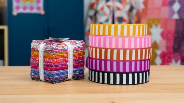 We're also super excited about the brand-new Stitch Supply webbing. It's gorgeous and works really well with bold lines. We made a sample using the Maeve Collection by Crystal Manning, and it looks fantastic. Maeve fabric in stores October, webbing in stores now! This webbing is a must-have for any sewing room. It pairs beautifully with almost any Ruby Star Society as well!