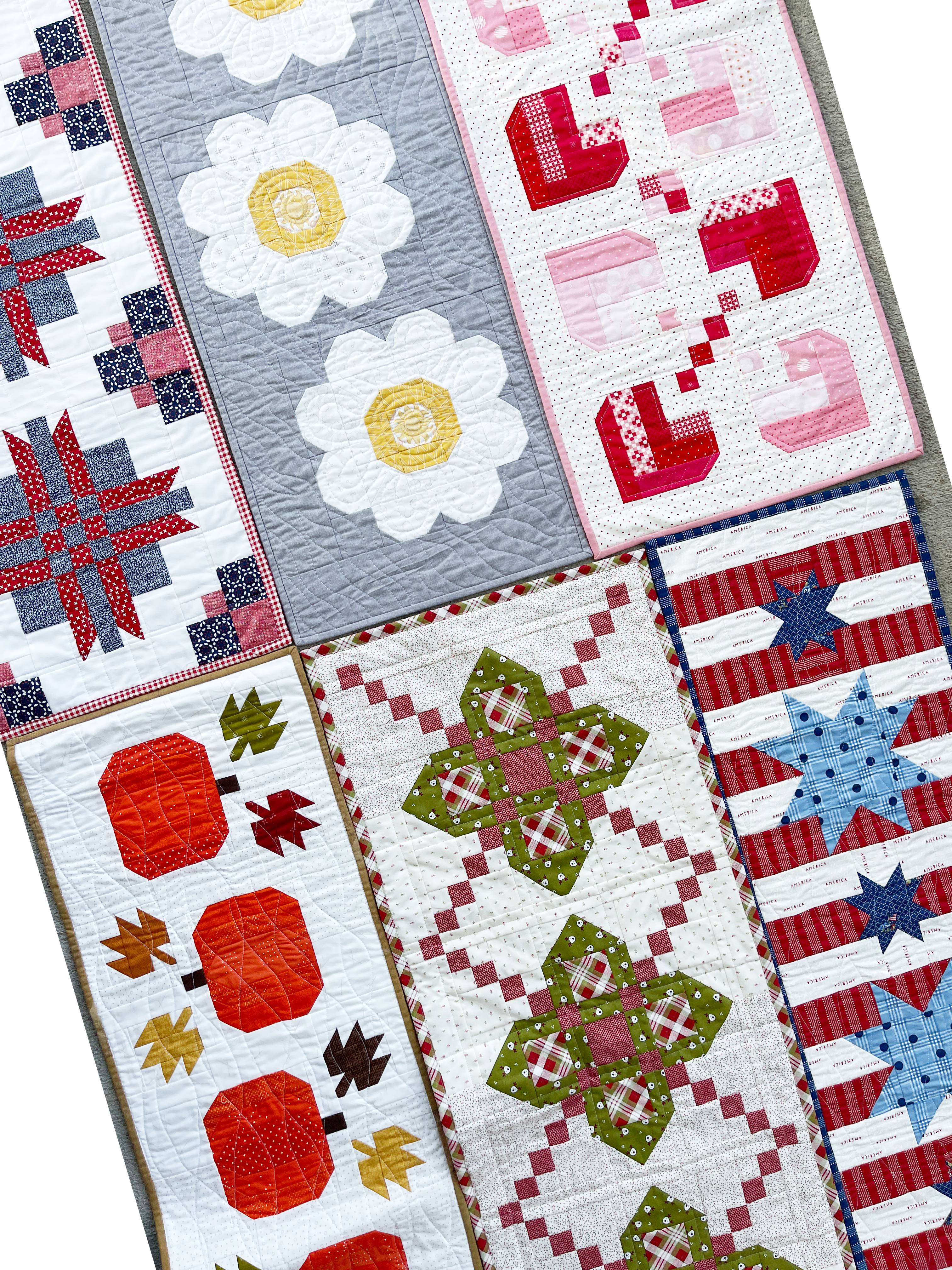We'll be back here on the Moda Blog on the 3rd Thursday each month with a new series - the Table Runner Club! In January, we will be sewing the Bowen Table Runner (top left in the photo below). Ask your local shop to carry and kit up the pattern for you or any of our fun to make and sew patterns.