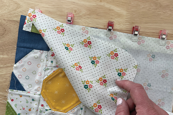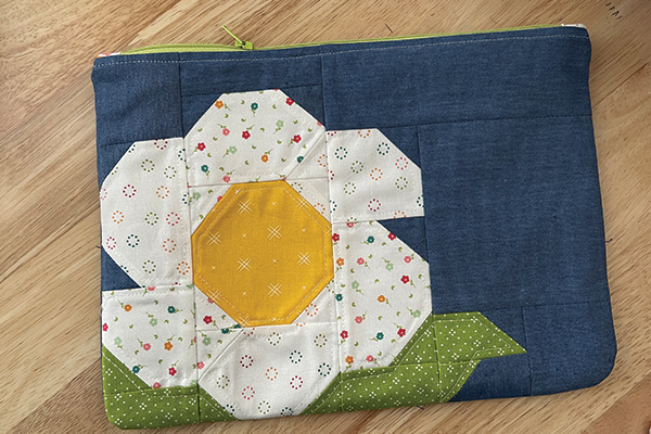 This pouch front comes together in sections. Follow the directions in the pattern to join units together and then sew the three sections together to finish the pouch front.