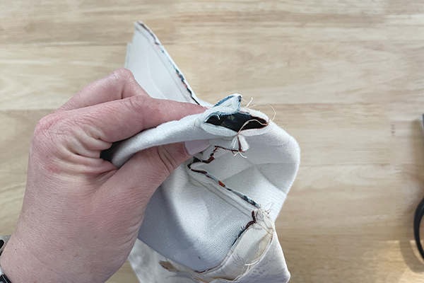 Pinch the bottom corners as in the photo below and sew them closed to box the corners of both the exterior and the lining.