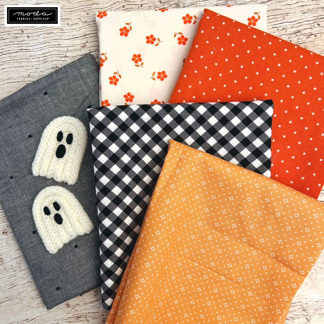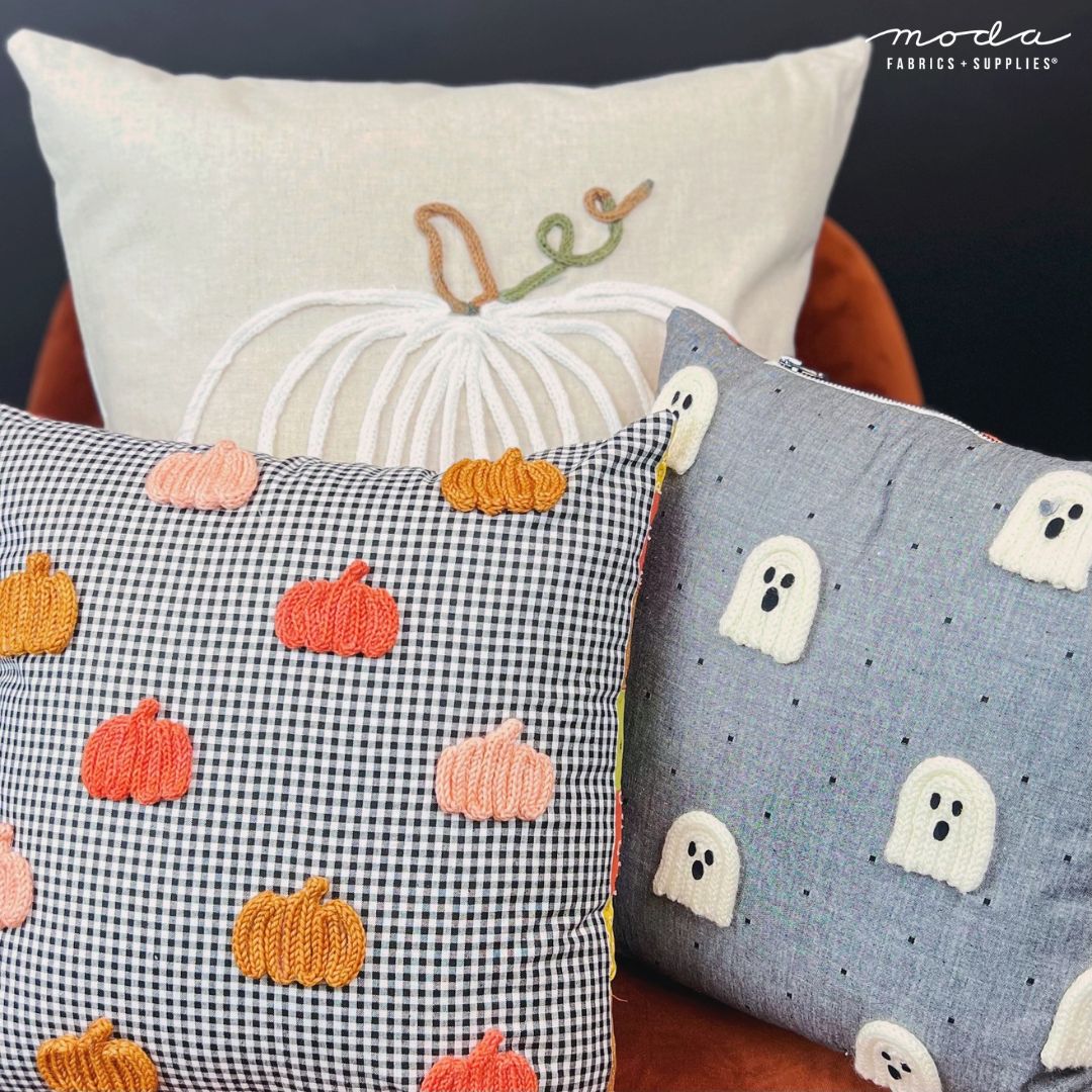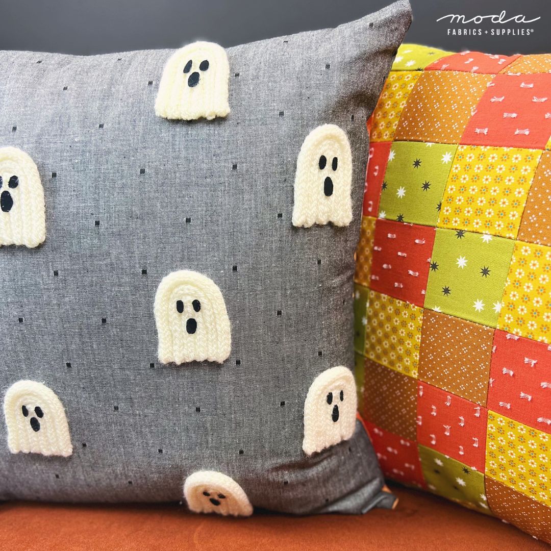 Jessie made the cutest pumpkins and ghosts with her knitted cord and attached them to a couple of pillow covers we stitched up! The pillow fronts are made with Moda wovens, and the pillow backs are festive patchwork – making these pillows reversible for double the fun.