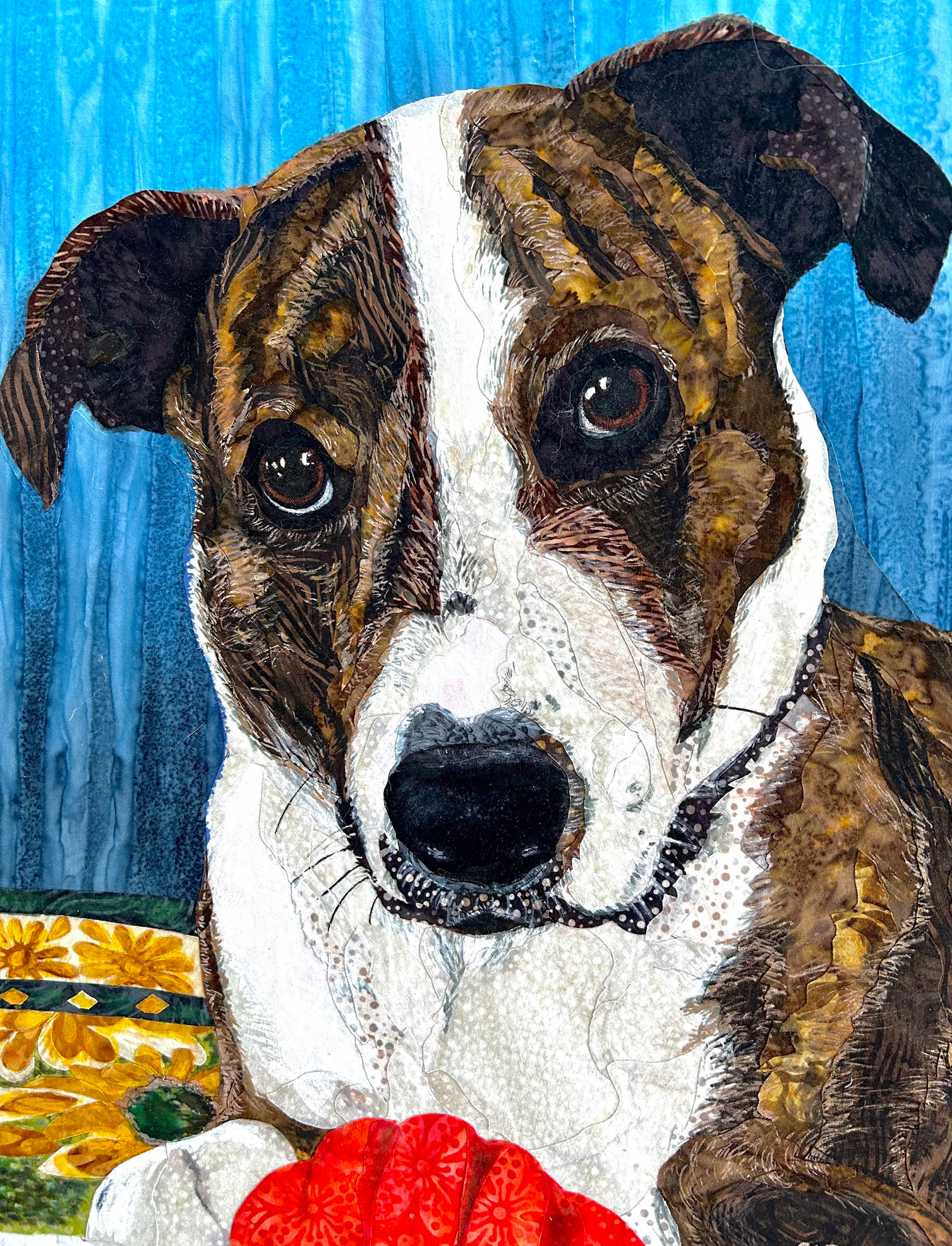 Even in her little bit of down time, Debra loves to be around fabric, saying, “Fabric is such an amazing medium to work with. Right before the pandemic, I took a class with Barbara Yates Beasley on learning more about the fabric collage technique. I finished a fabric collage of Luna, our little pupper, and I am working on one of our cat, Oscar.”
